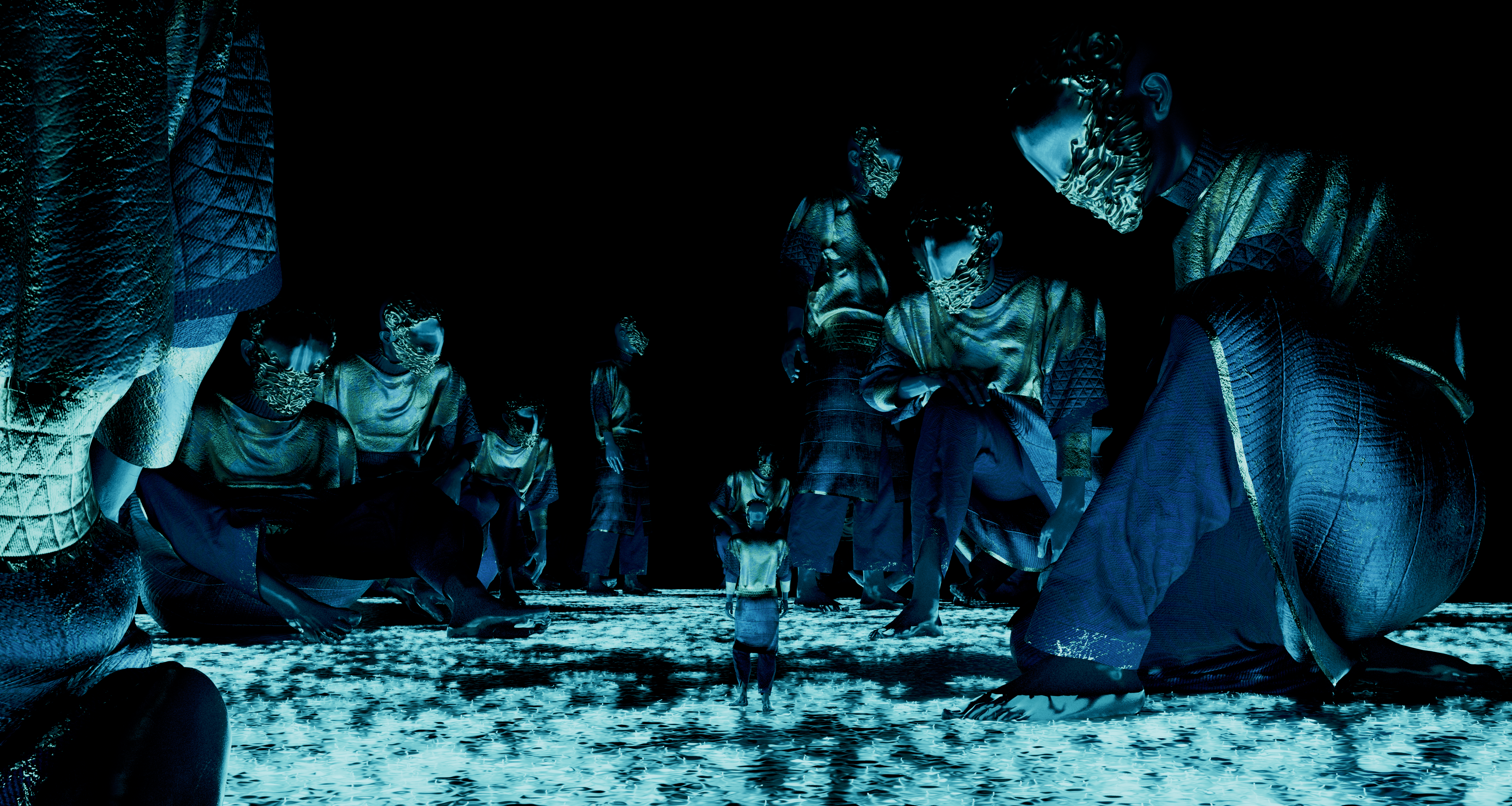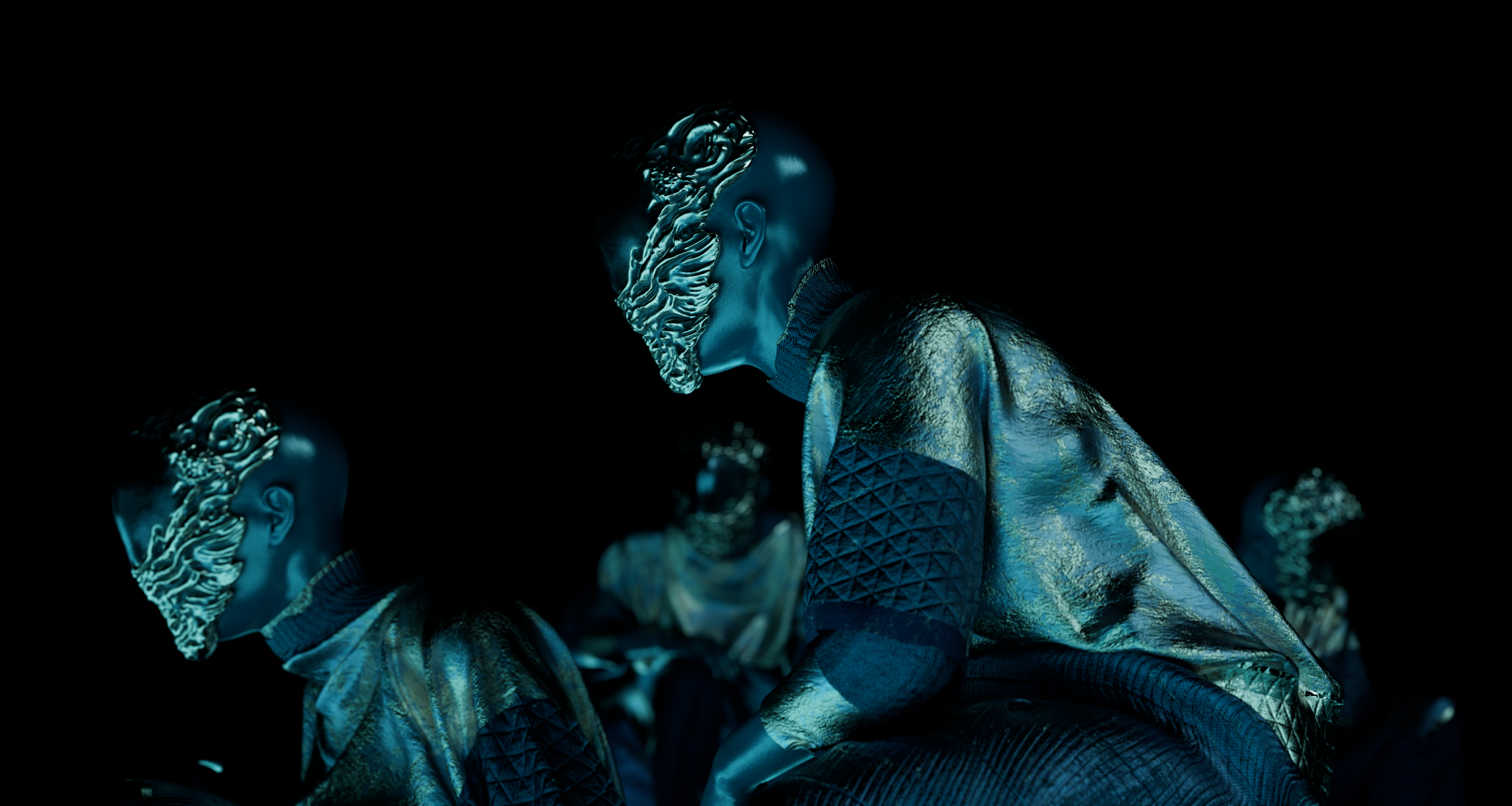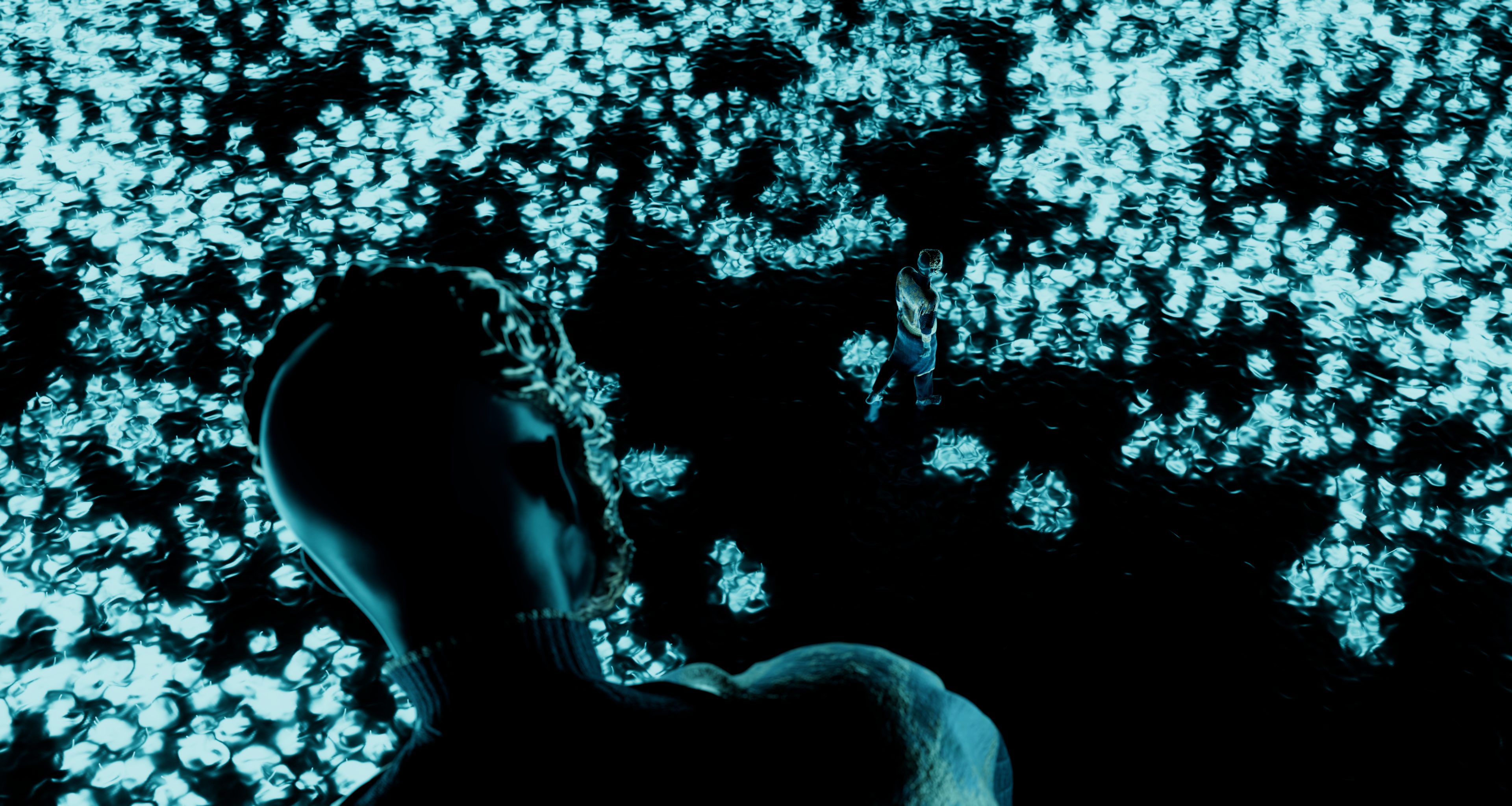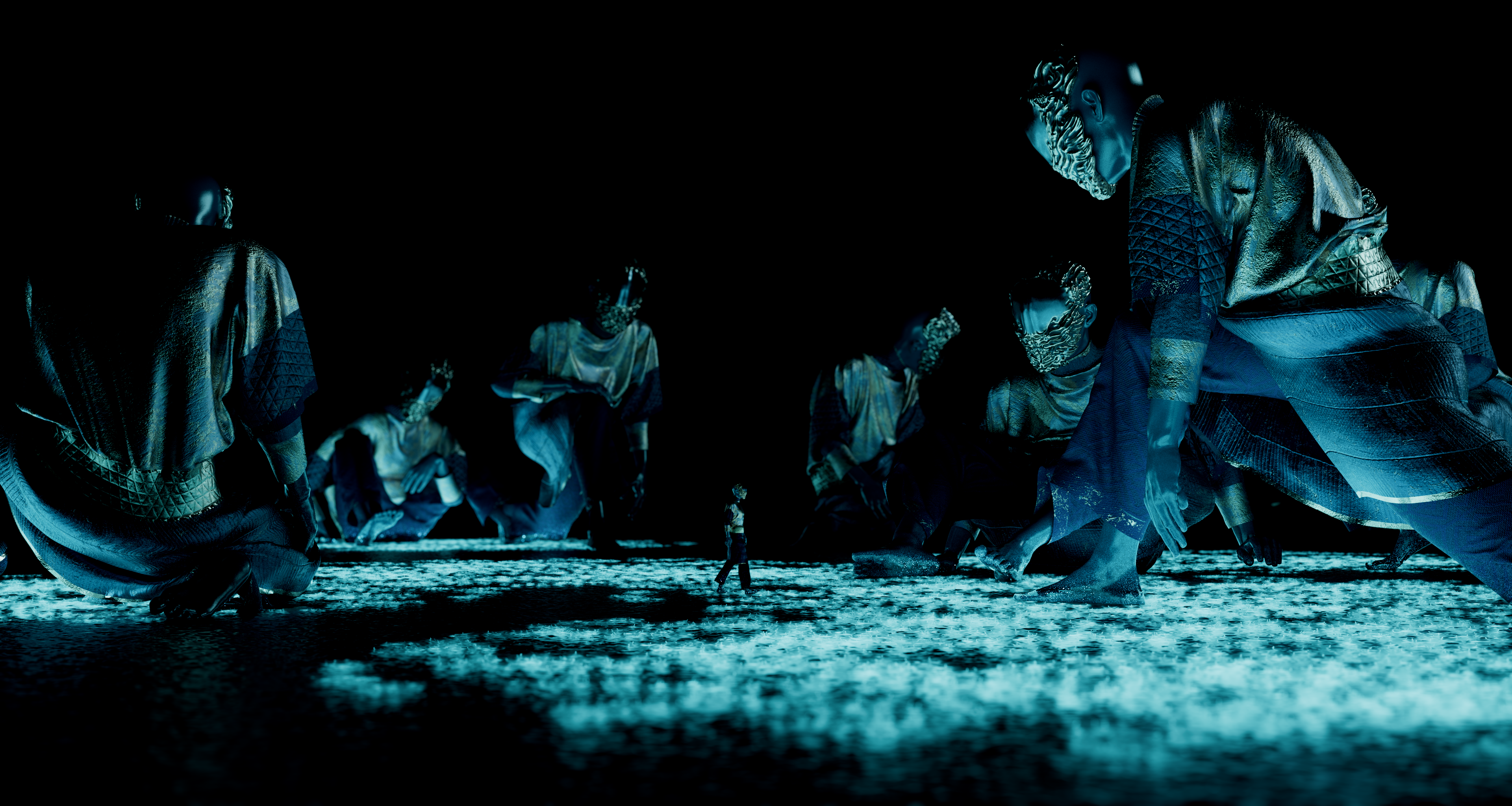 A slow reverie depicting alternate versions of the self (this version of you) watching your journey – Motion capture drives the walk cycle as well as the various poses of Alexy Préfontaine's Traveler character. The next step was to simulate the cloth and portray the correct mood through lighting.
