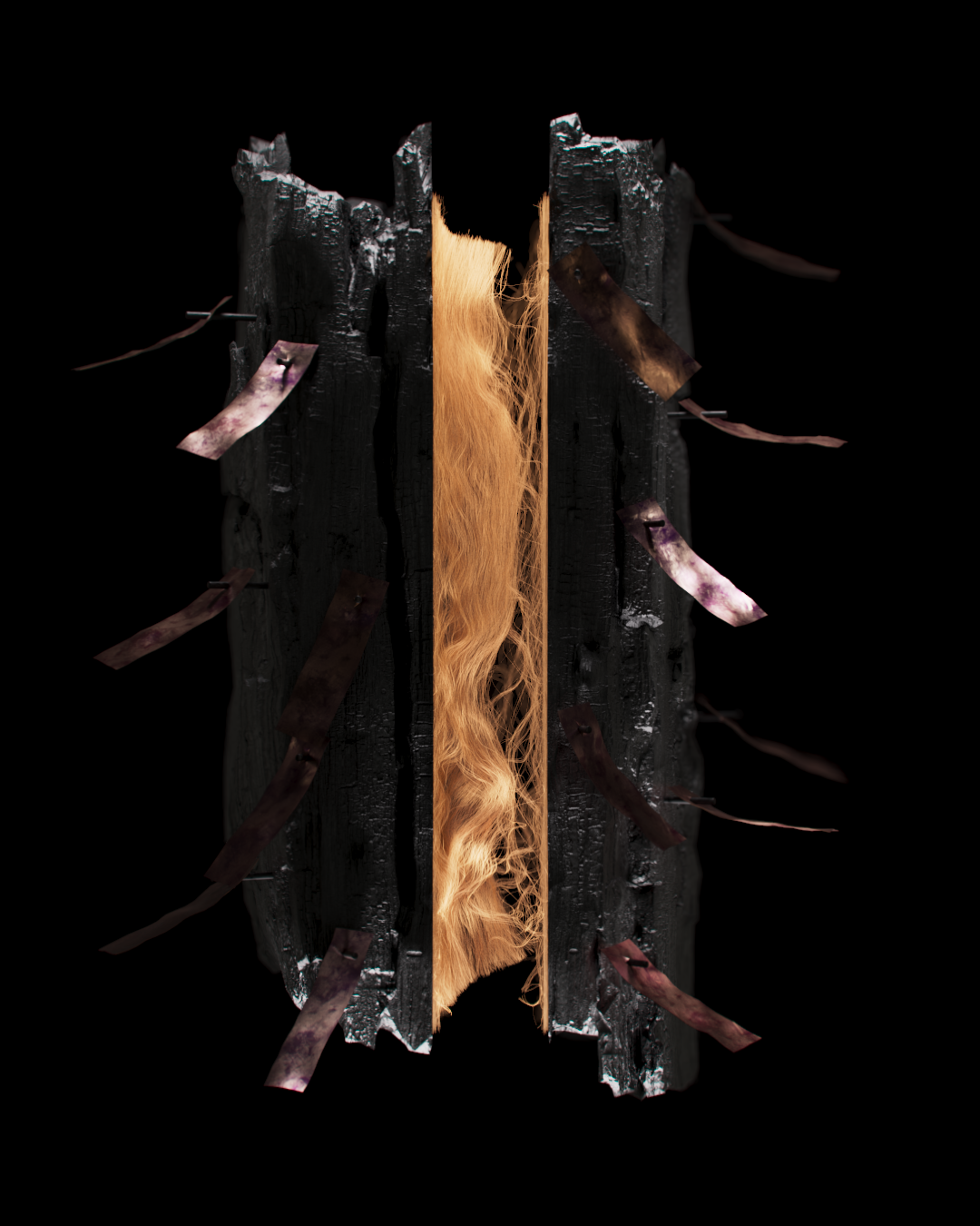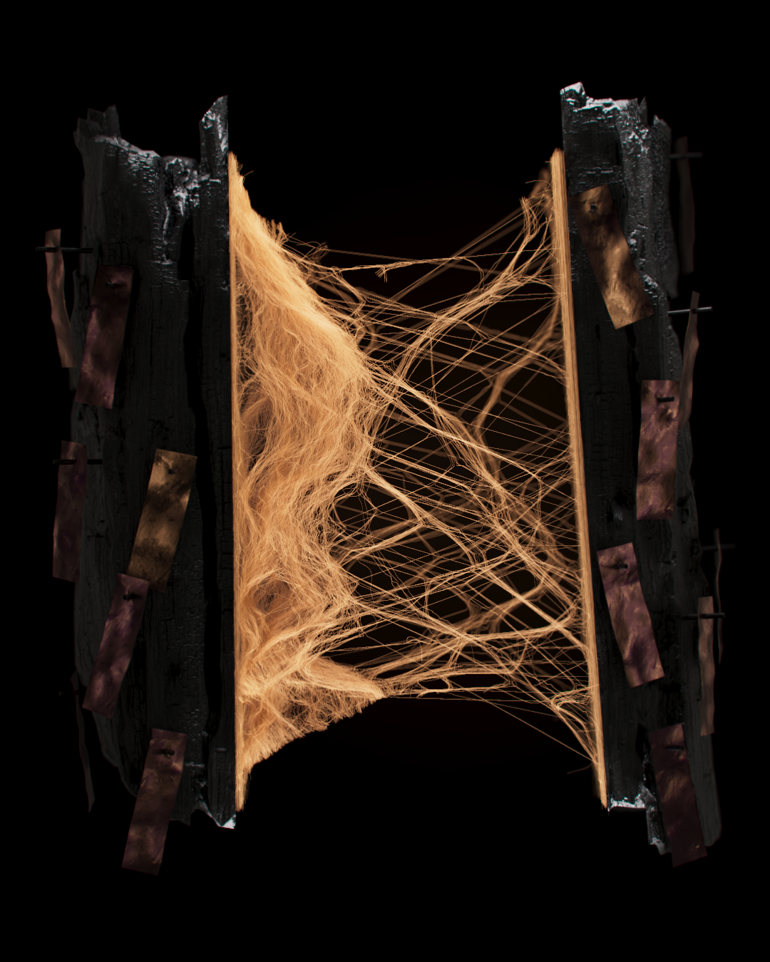 My latest experiment – sticky hair, carbonized cedar (yakisugi), and oxidized copper. I also recorded the music and sound design.